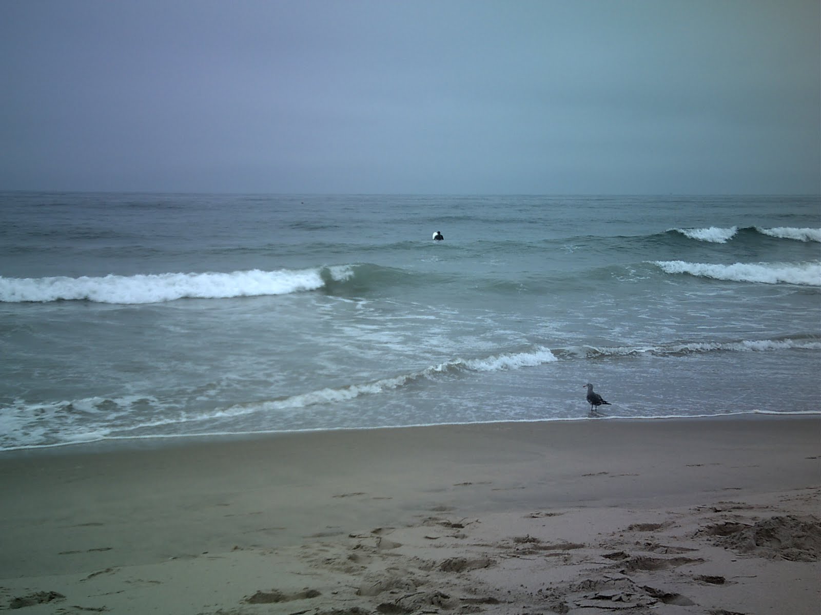 It was warmer, but still cool. I really never thought we’d be sitting in the beach in our sweats shivering. But we got to watch surfers, sea gulls, fishermen and runners along the beach. I never wanted to leave. The morning was still overcast, we didn’t get out of the cloud cover until we were almost to Santa Monica. Instead of the ocean being shades of black, the water took on a greenish color that complemented the grey sky. The white caps of the waves started out brown as they picked up sand on their way up the beach.