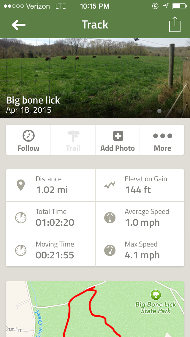 I’ve been ALL OVER this app since downloading it. As the weather warms up – and on the rare Spring days when its not raining or flooding – I’ve been hiking as much as possible. It’s fun, it gets me out of the house and it’s good exercise. I have a decent working knowledge of parks and trails in the area just from my own explorations in the last few years. So a lot of the local trails listed are places I have been to, or at the very least know about. But the feature I like about this app the most is the trail reviews.