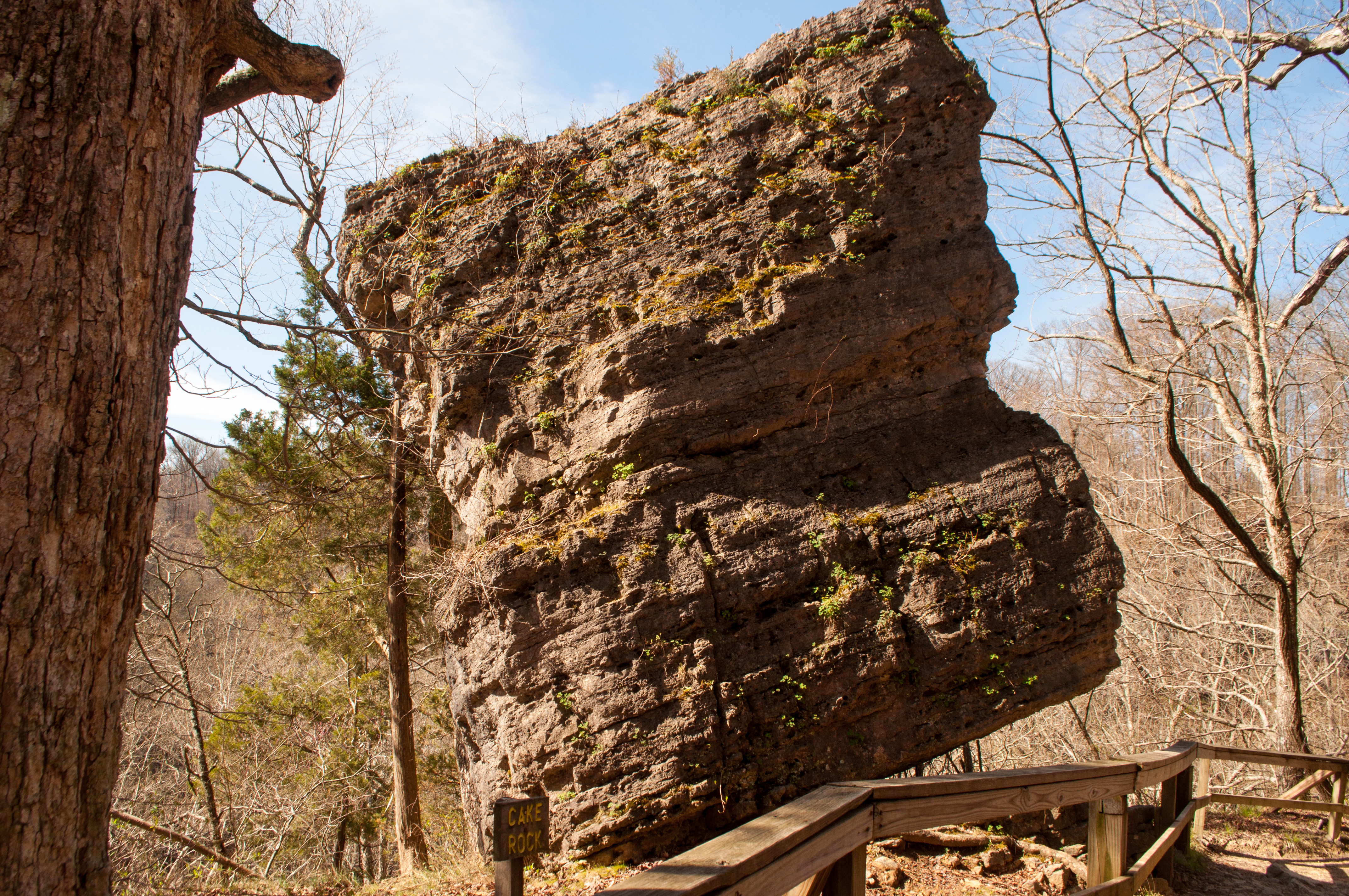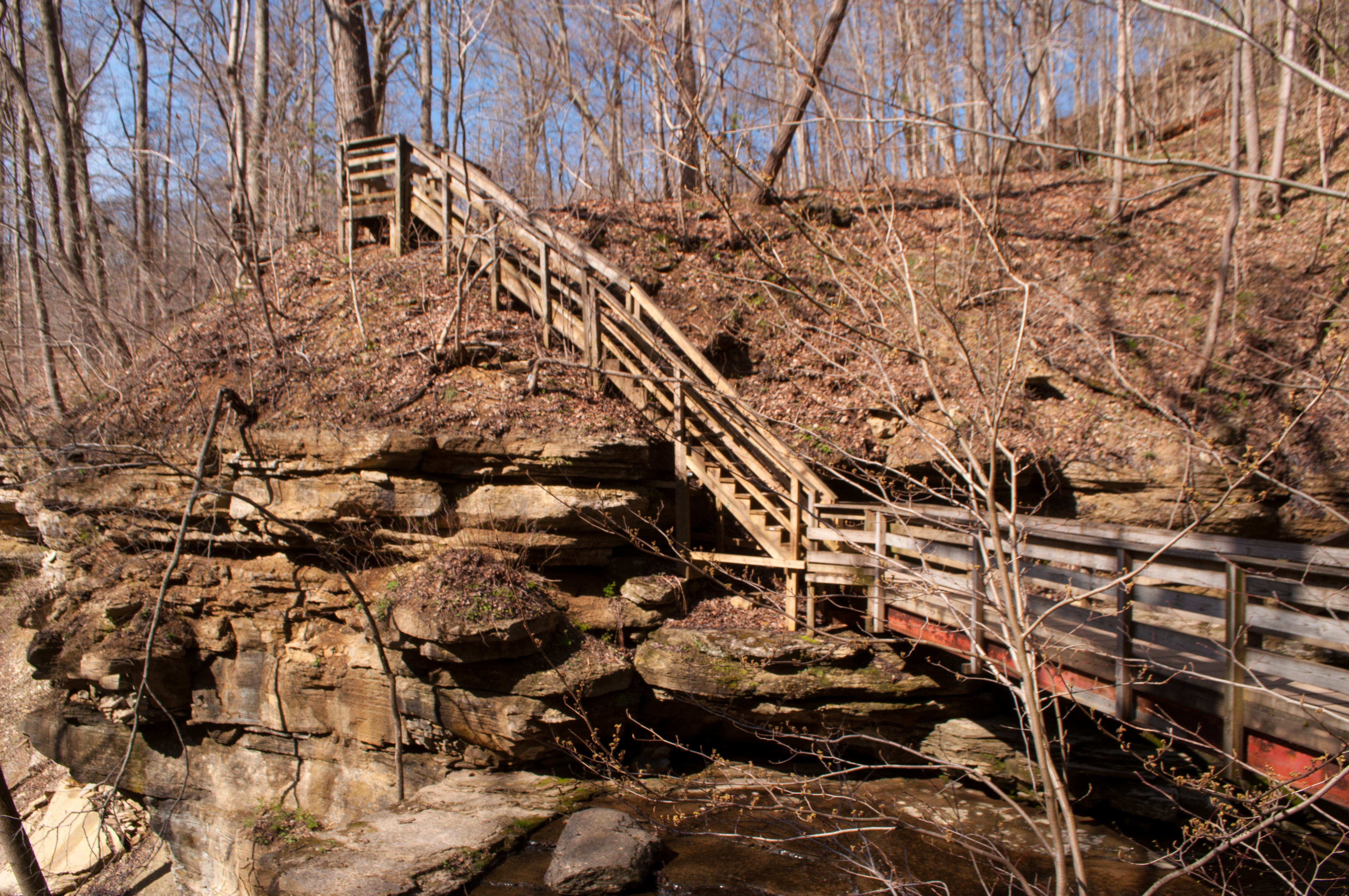 It starts out ADA accessible, then goes down steps. You do have to come back out, but it’s not as bad as it seems going in. Take a right halfway down the first batch of steps and the trail will take you under a rock ledge to another view of Big Clifty. When you get back to the steps you can either keep going straight or take another right and complete a short loop through the woods.